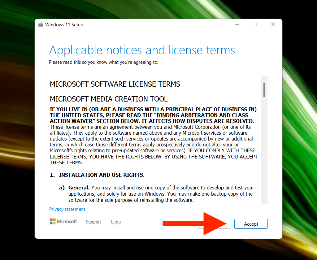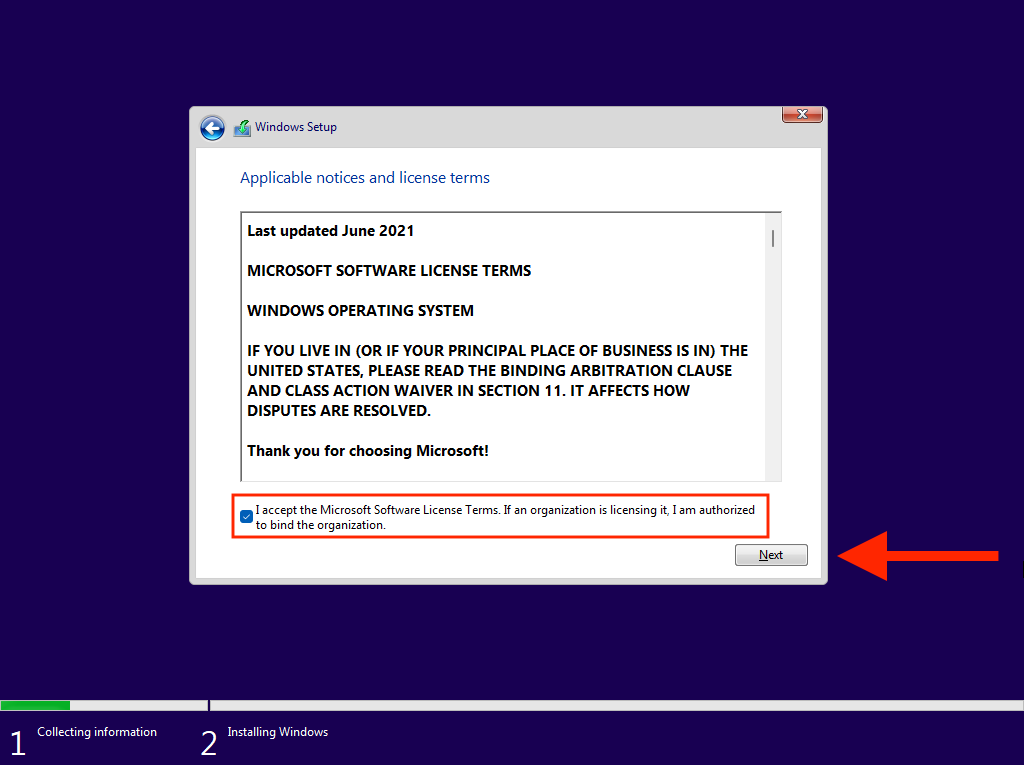 - Select Accept to agree to Microsoft’s software license terms.