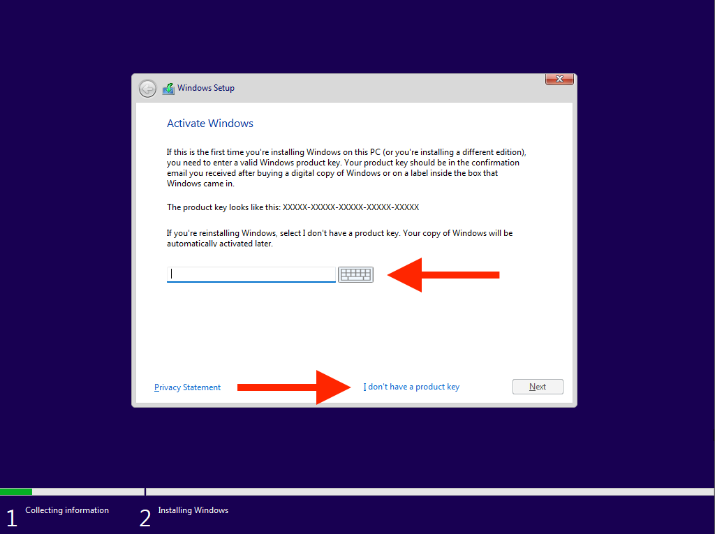 - Enter your Windows product key and select Next. If you don’t have one or want to activate Windows 11 later, select I don’t have a product key.