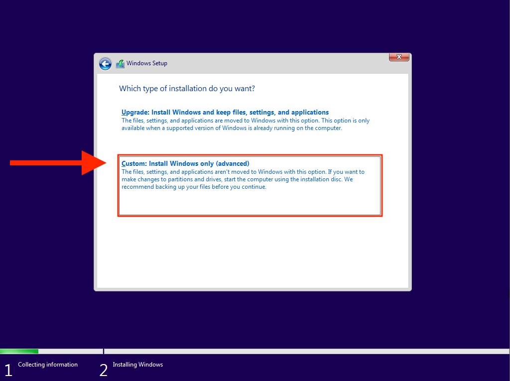 - Select the option labeled Custom to clean install Windows 11. If you want to upgrade from a previous iteration of the operating system while keeping your data intact, select Upgrade instead.