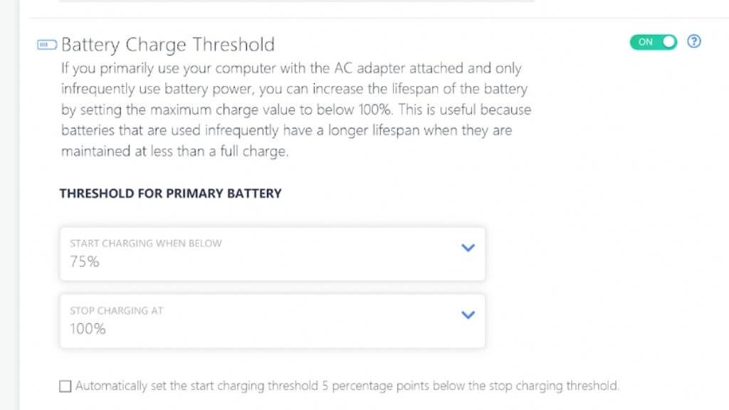 If your laptop supports a charging threshold, you can most likely find the manual setting in the UEFI menu (the replacement for the old BIOS technology). Since that’s not convenient to access, many laptop manufacturers offer a first-party app to toggle those hardware-level settings without rebooting your system.