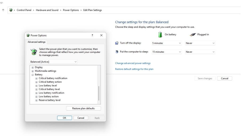 If you open up Power Options in Windows 10 or 11, open advanced power settings, and expand the** battery section**, you won’t find much there.