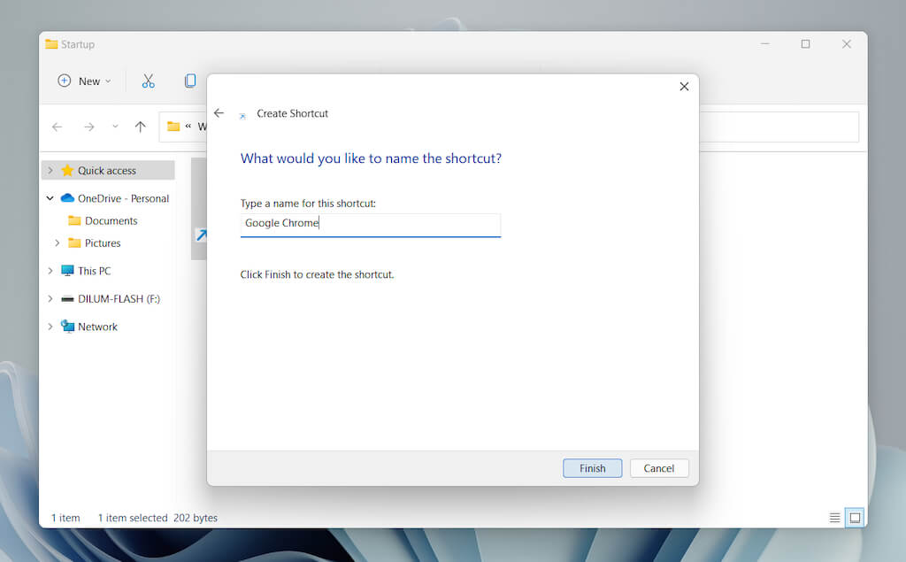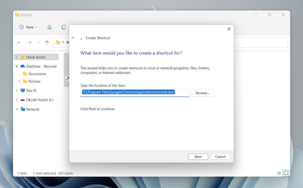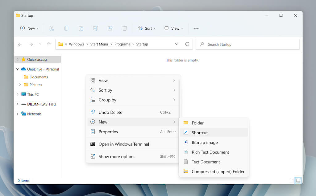 - Right-click a vacant area within the Startup folder and select New > Shortcut.
