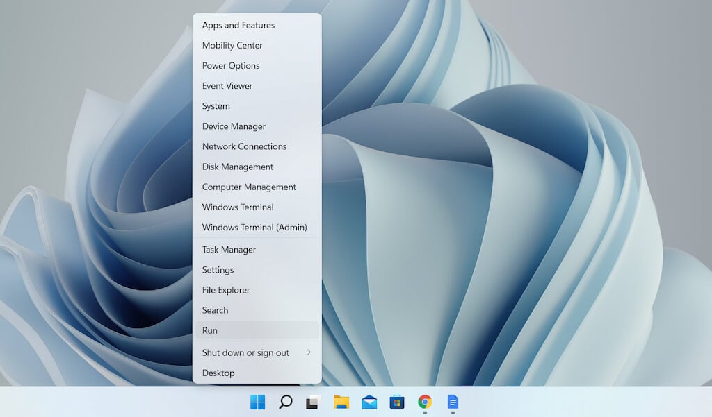 - Right-click the Windows Start button on the taskbar and select Run. Or, press **Windows Key **+ R.