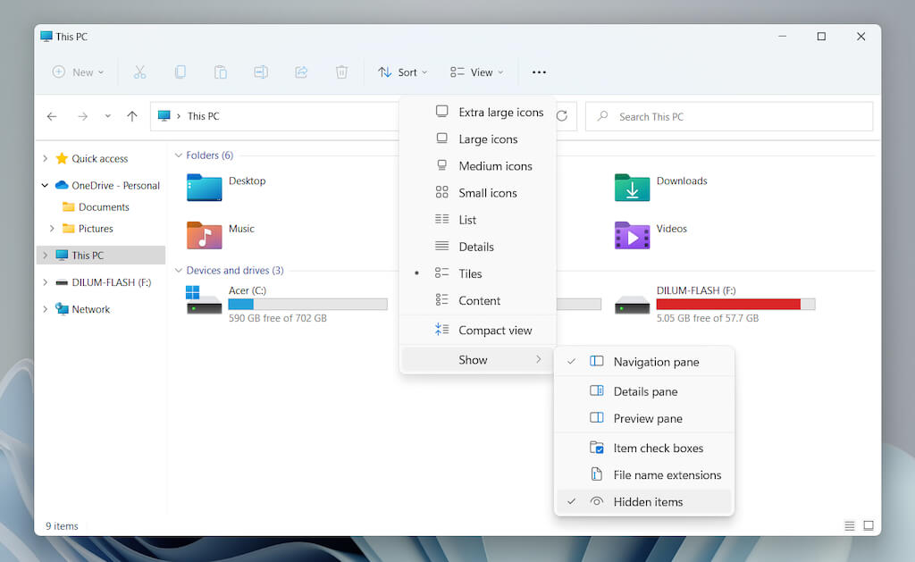 - Open a File Explorer window and select View > **Show **> Hidden items.