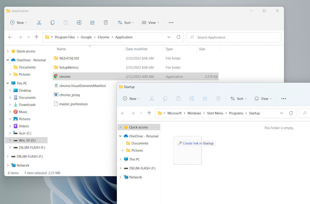 - Drag the executable file into the Startup folder and release it once the cursor changes to Create link in Startup.