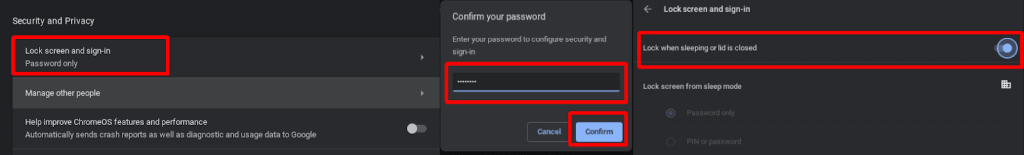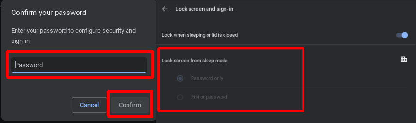 - Enter your Chromebook password and click Confirm. * Under Lock Screen From Sleep Mode, select either Password Only or PIN or Password is selected.