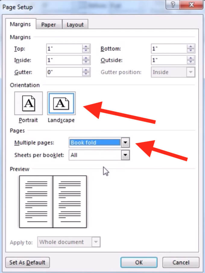 - In the Page Setup window, follow the path **Margins** > **Multiple pages **> **Book fold**.
