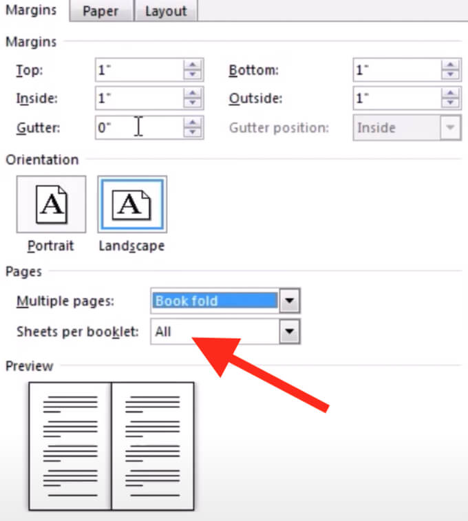 - Change the page **Orientation** to **Landscape** if it didn’t change automatically. * Under **Margins**, you can also set up the right value of **Gutter** – the amount of space that you want to leave for binding. * Open the **Paper** tab and select **Paper size** if you want to change the size of your booklet. Note that the physical size of your booklet is half of the paper size that you set up. * Under the Layout tab, you can edit your booklet’s appearance further. For example, you can add borders to every page by following the path **Page Setup** > **Layout **> **Borders**.