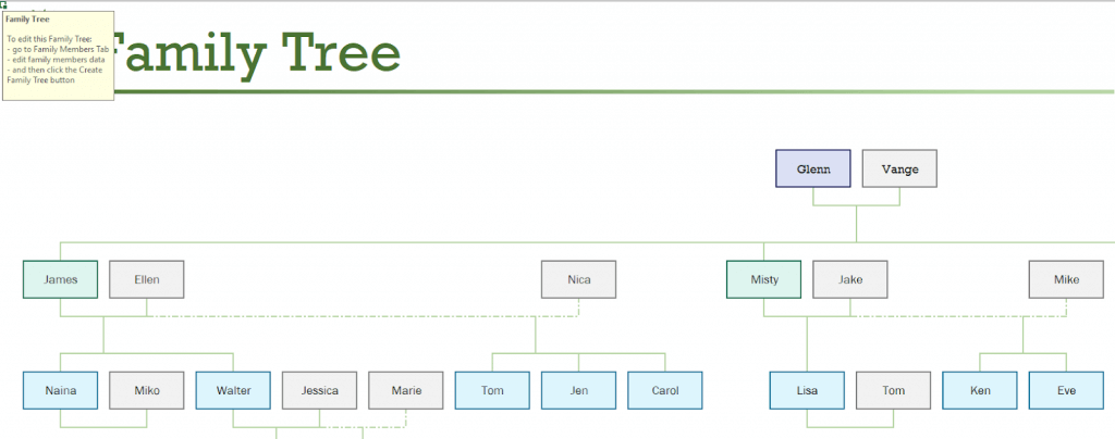 - Once you’ve added all of your relatives, switch to the Family Tree spreadsheet to see the final product.