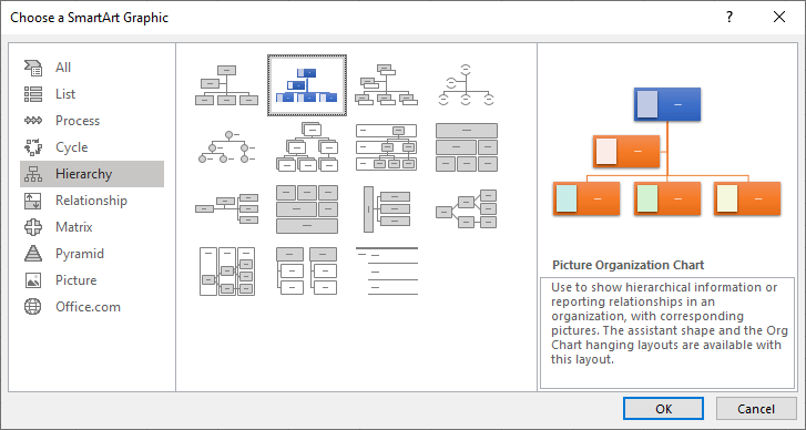 - When the window opens, select Hierarchy from the left-hand menu. This will show you a set of organizational charts you can use. If you want to add family photos, select one that allows pictures like the Picture Organizational Chart.