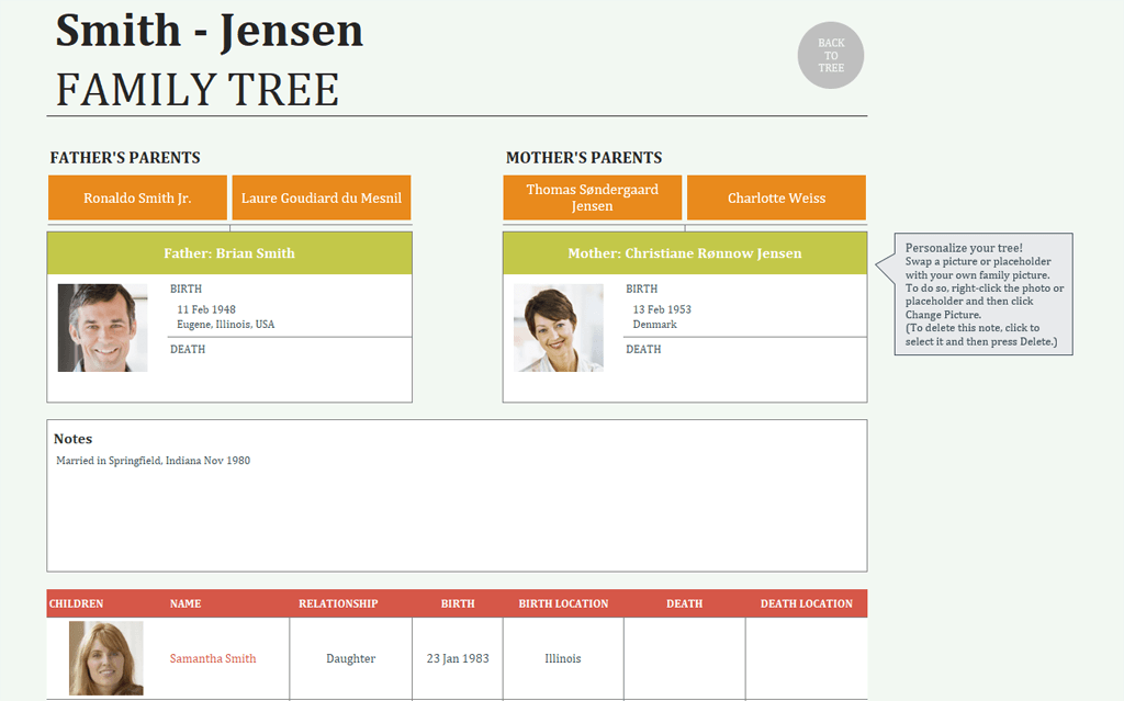- In the Excel workbook, you’ll see seven pages for each member of your family. Select any of these to add details including middle names, birth dates, death dates, family relationships, and so on. You can also add family photos for each member.