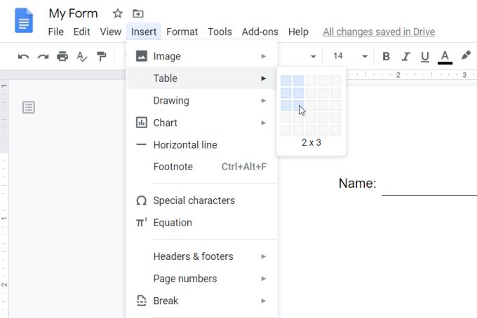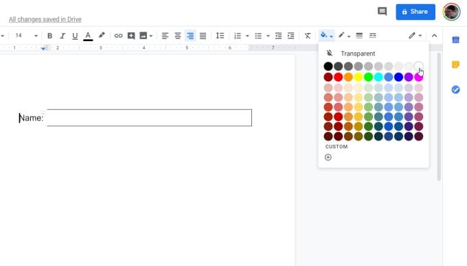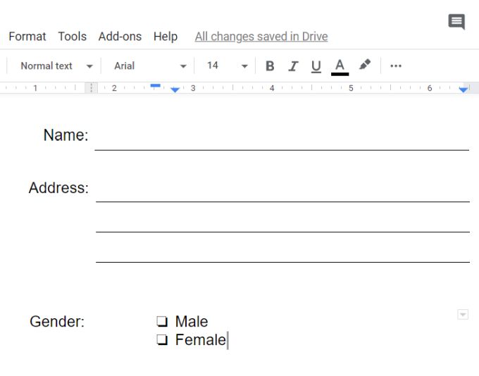 You can make a fillable Google Docs form with many different elements using tables. Read on to learn how. If you want to see the final product, check out the final form here.