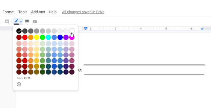 Creating a cell with just a bottom line in Google Docs is a little tricky, because you have to change the color of the top and side lines to white while leaving the bottom line unchanged.