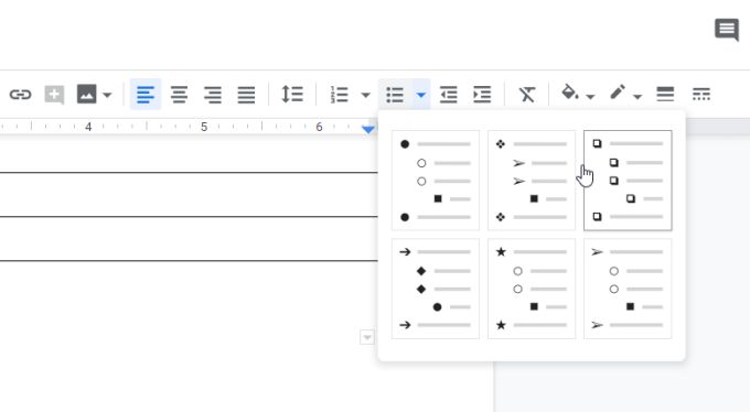 Next, place the cursor in the right cell. Insert a checkbox by selecting the down arrow next to the bullets icon and select the checkbox option.