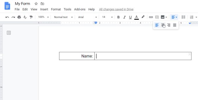 This inserts a plain looking table with just a couple of fields. Type the label for your first field in the left cell, and select the right-align icon from the ribbon to align the text to the right side of that cell.