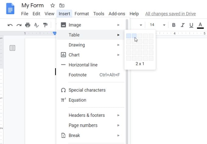 Select Insert from the menu, select Table, and then select the 2 x 1 size for your table.