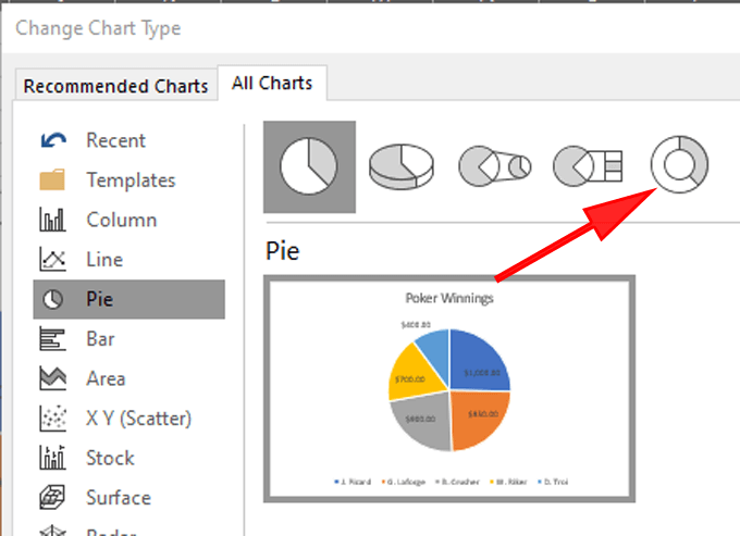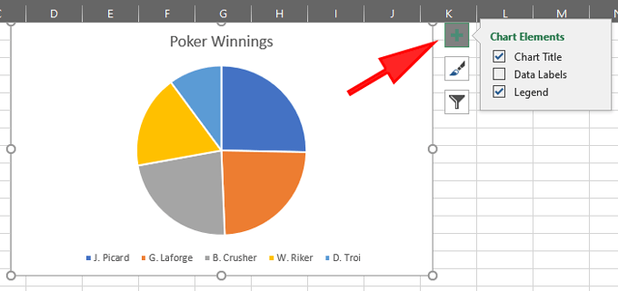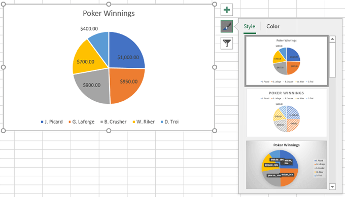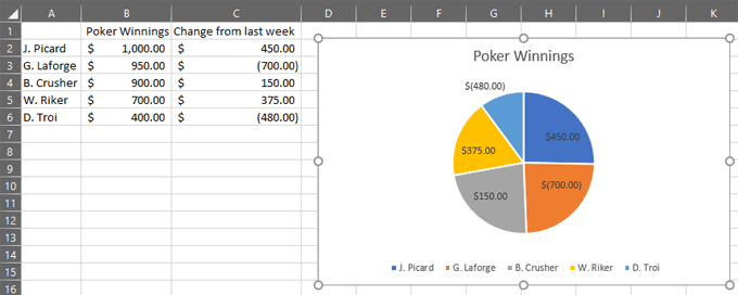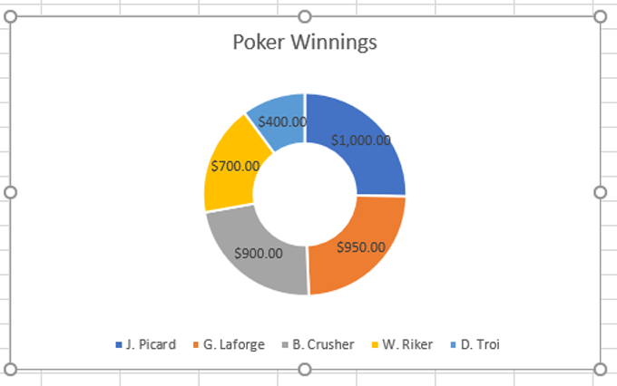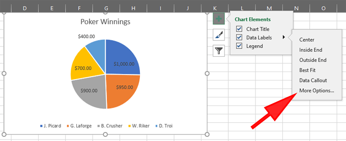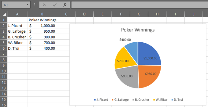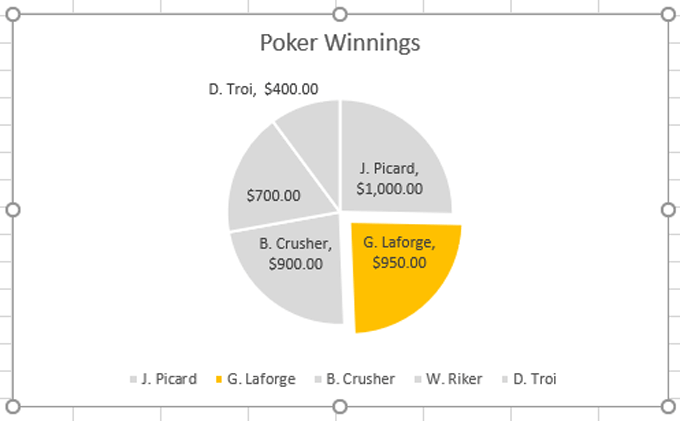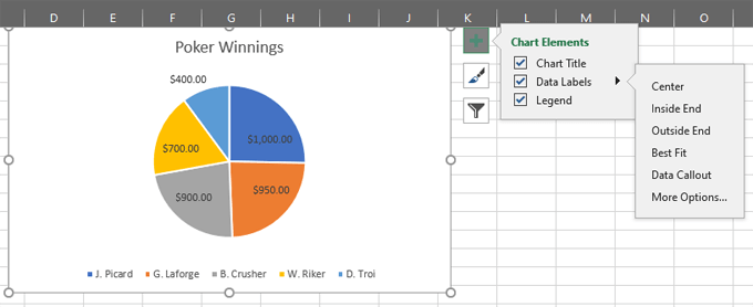 - **Series Name: **Checking this option will add the heading of your data column to every slice of the pie. In our example, each slice of the pie would get a label saying “Poker Winnings.”