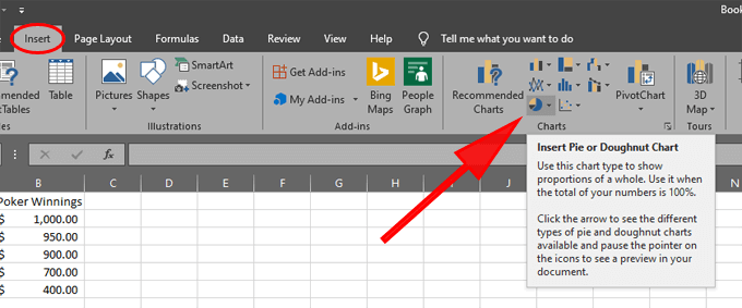 - Select the **Insert** tab, and then select the pie chart command in the **Charts **group on the ribbon.