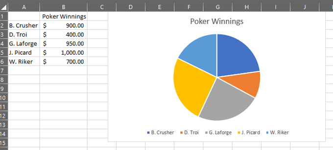 You can change the Chart Title if you like. Excel automatically uses the header of the column where your chart data is stored—in this case, “Poker Winnings.” If you update the text of that column’s header, the pie chart’s title will update automatically. Alternatively, you can double-click on the chart title itself and edit it.