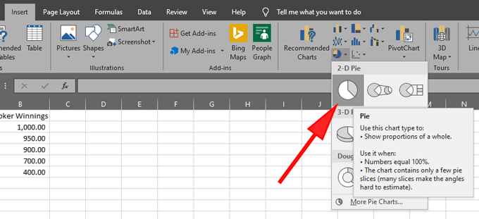 - You’ll see a number of pie chart options available. For now, let’s choose the basic 2-D pie chart. As soon as you select the 2-D pie icon, Excel will generate a pie chart inside your worksheet.