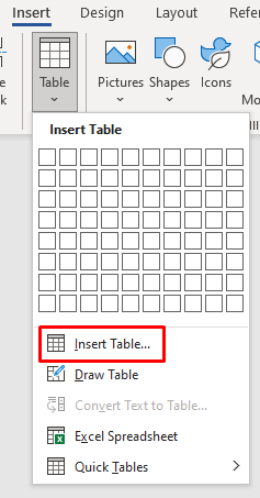 - When the Insert Table dialog box opens, it’ll show a basic grid pattern and menu options below it.