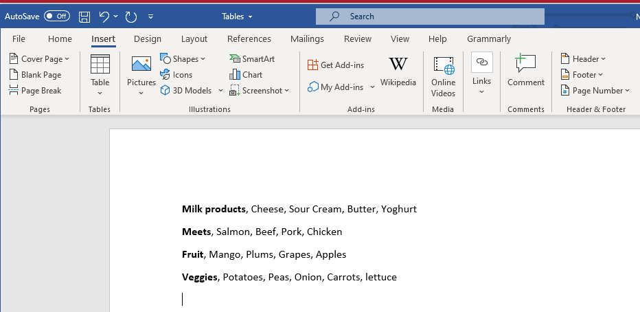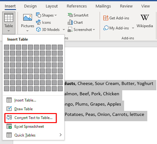 Microsoft improved this feature, and now you can separate the table fields with commas, paragraphs, or any other separation characters. Let’s see how to convert a simple grocery shopping list into a table.