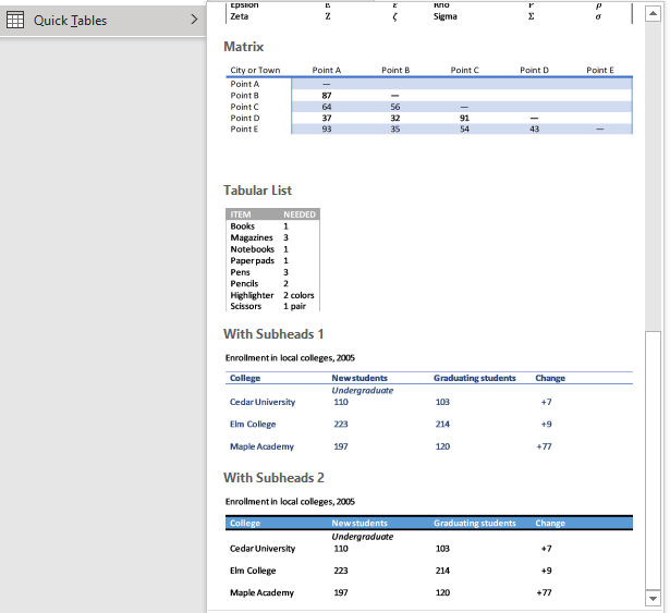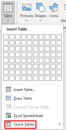 - Go to Insert, then select Tables, and Quick Tables.