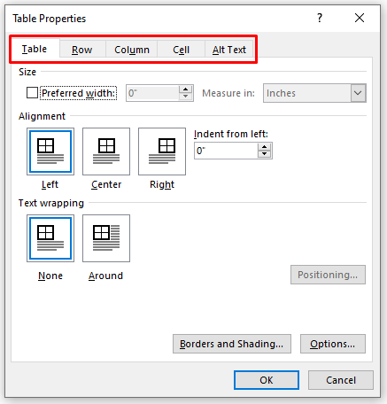- When a dialog box opens, use the Table, Row, Column, Cell, and Alt Text to adjust their size, text wrapping, alignment, and more.