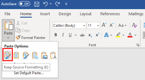 - Select the Paste drop-down menu on the Home tab in Word and choose Keep Source Formatting.