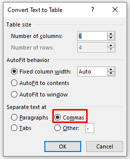 - In the dialog box, make sure that Commas are selected under the Separate text at the panel. Then click OK.