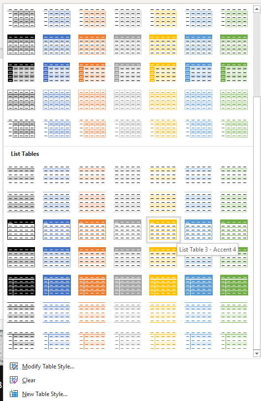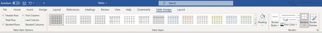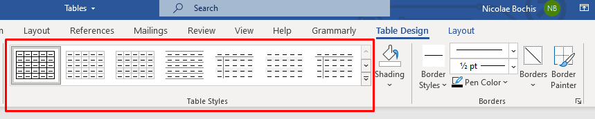 Table Design and Layout tabs are filled with helpful table tools you can use to format tables. Use Table Design to stylize your table and change its looks. Here you’ll find tools for shading, painting borders, and setting their thickness, style, and color. You can also select one of the many offered table styles.