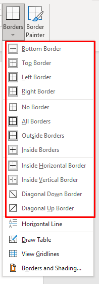 - Click Borders. A drop-down menu will let you choose the type of borders you want to add. Add them around each cell, or only highlight the outside of the table with borders. Place the cursor over the options, and you’ll get a preview of how each one changes your table.