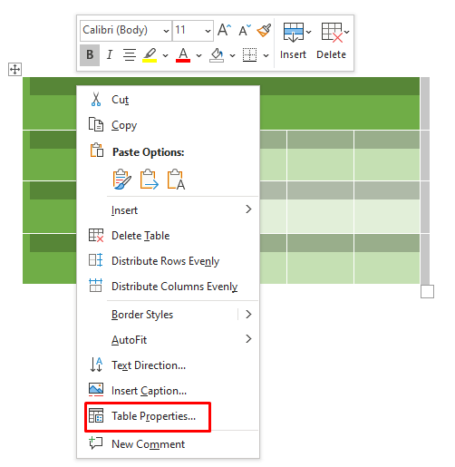 - Select your table and right-click it. Then, choose Table Properties from the menu.
