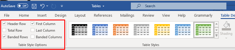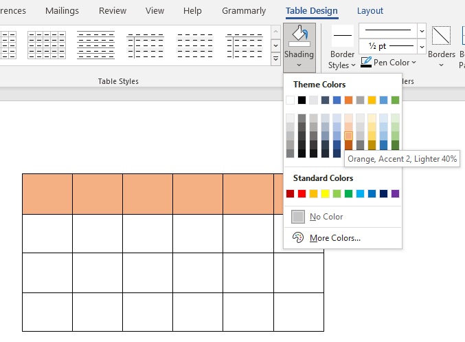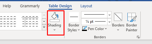 Spice things up by adding a background color to your tables. Use the shading drop-down menu to choose a color with which you’ll shade your table. You’ll find it in the Table Design tab.