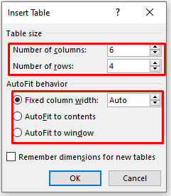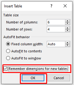- If you want your future tables to remain this size, check the Remember dimensions for new tables option. Click the OK button to finish and create a table.