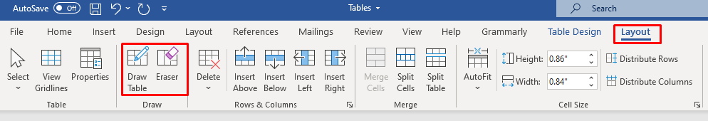 - Your cursor will turn into a pencil. Drag it down and across the document to draw a box. You don’t have to worry about the dimensions; you can modify them later. * Now you can start drawing cells and columns inside it. Simply drag the cursor to draw them one at a time. * If you need to add or remove columns or rows later, you can go to the Layout tab and select the Draw Table or Eraser button. This’ll allow you to continue drawing lines with a pencil cursor or to erase existing lines with an eraser cursor.