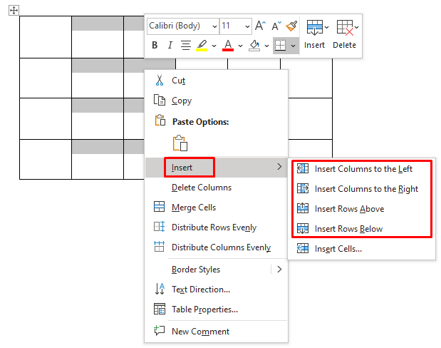 - Right-click, then go to the Insert menu and select to insert columns to the left or right and rows above or below.