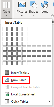 - Go to Insert, select the Table button, and choose Draw Table from the menu below the Grid.