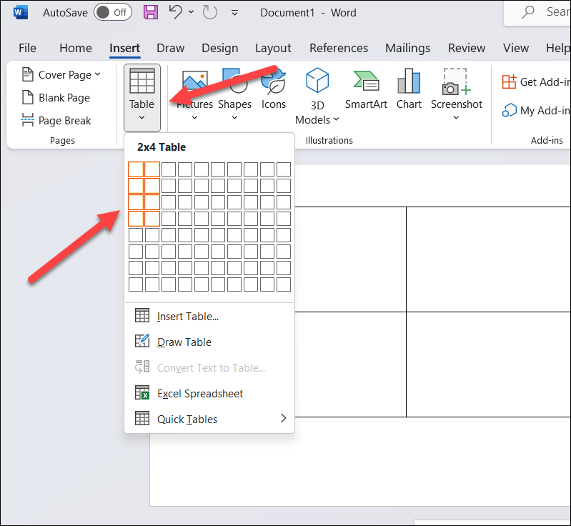 - If you wish to create multiple flashcards on the same document, press Insert > Table to insert a table with two columns and multiple rows. This will ensure that your flashcards are organized and easy to cut out (if you decide to print them).