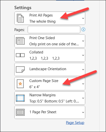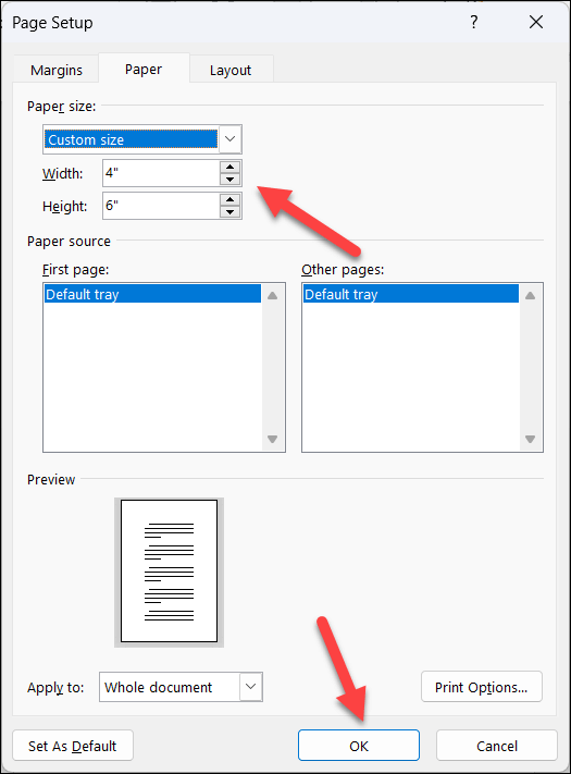 - In Page Setup, select Paper > Custom size and set Width to 4″ and Height to 6″. * Press OK to save.