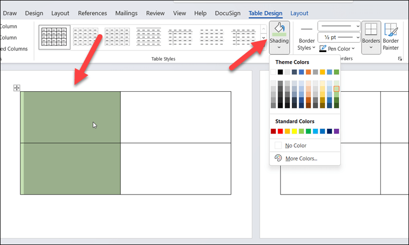 - You could also consider color-coding your tables by concept, idea, or term, or by coding them into question-and-answer pairs. This can help with memory association, making it easier to sort and locate specific flashcards. To do this, select a column in your table, then press Table Design > Shading and select a color.