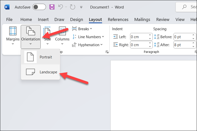 - Press the Layout tab and select Orientation > Landscape. This will change the orientation of your document to better fit the flashcard format.