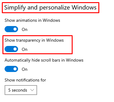 - In the main window, scroll down until you see Simplify and Personalize Windows section. Toggle on the Show transparencyin Windows option.