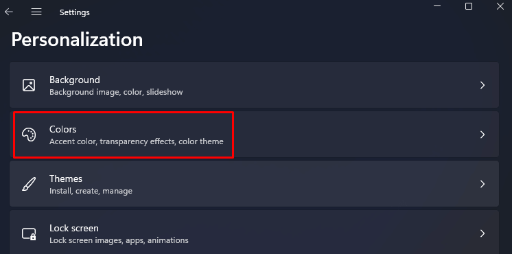- Navigate to Settings, Personalization, and finally Colors, just as in the previous step.
