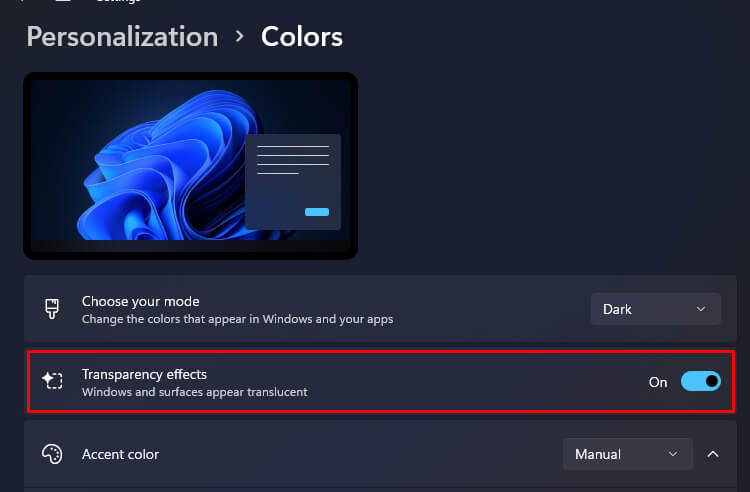 - Find Transparency Effects and toggle the switch on.