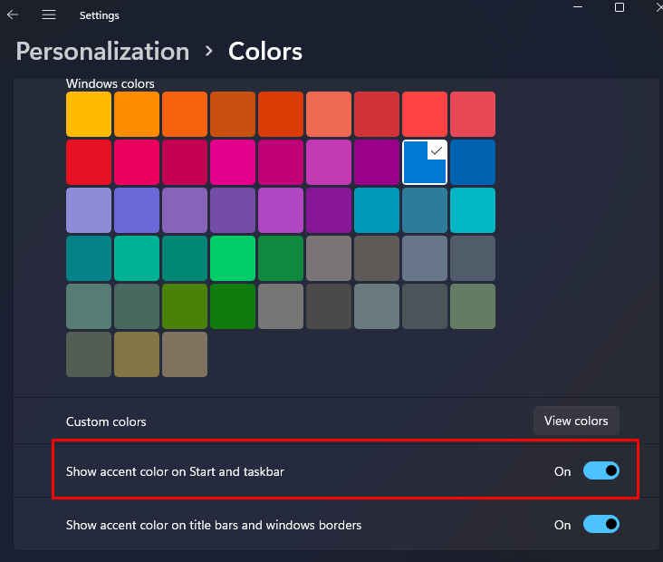 - Select the color you want to add to the taskbar, from the offered color grid.