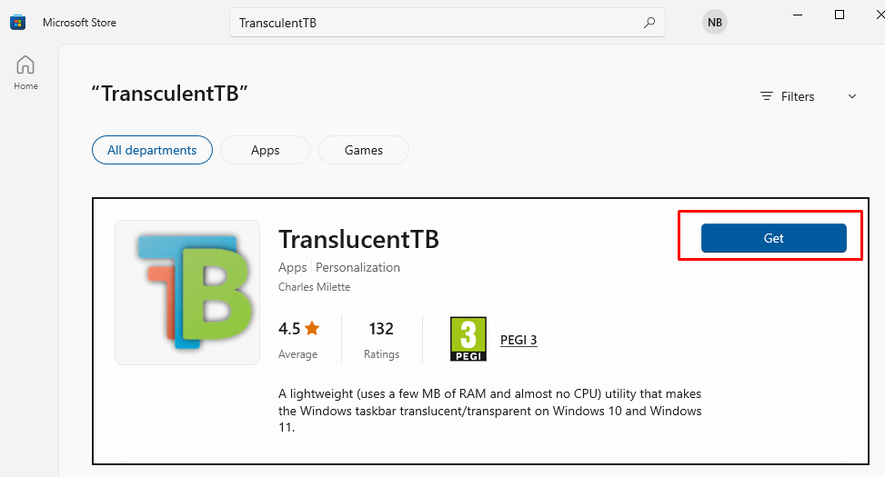 - Go to the Microsoft Store page and type TransculentTB in the search bar. When the app shows up, click Get it, and it will be installed on your device.