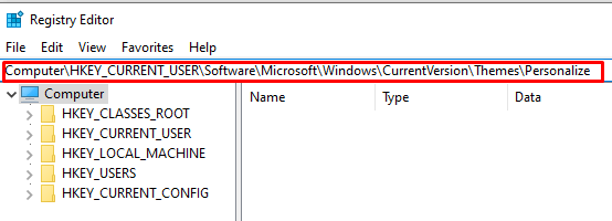 - In the address bar at the top of the quick navigation of the registry editor type: Computer\HKEY_CURRENT_USER\Software\Microsoft\Windows\CurrentVersion\Themes\Personalize