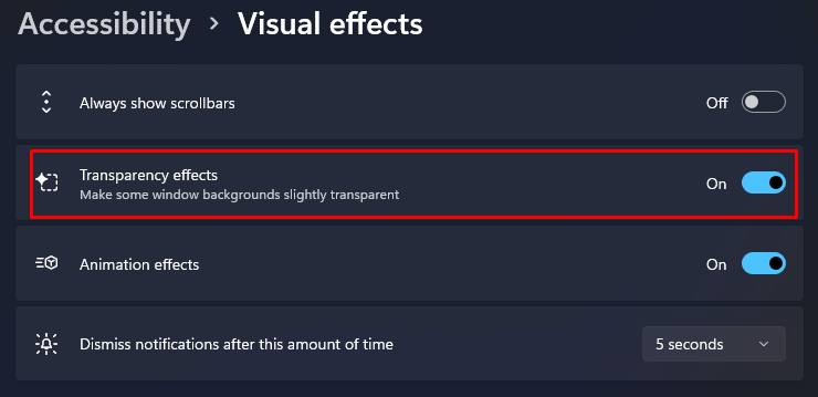 - Find Transparency effects, and toggle the slider next to it.