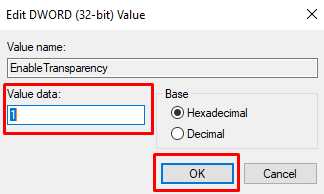 - When a pop-up window appears, if the Value data is set to 0 (zero), you’ll need to change it to 1 and press OK to continue. This will immediately change the taskbar transparency and you won’t need to reboot your system.